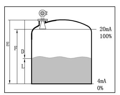 通過輸入空罐高度E(=零點),滿罐高度F(=滿量程)及一些應用參數(shù)來設定,應用參數(shù)將自動使儀表適應測量環(huán)境。對應于4-20mA輸出。