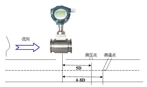 a)測(cè)壓孔和測(cè)溫孔的安裝設(shè)計(jì)。被測(cè)管道需要安裝溫度和壓力變送器時(shí),測(cè)壓孔應(yīng)設(shè)置在下游3-5D處,測(cè)溫孔應(yīng)設(shè)置在下游6-8D處,見圖(七)。D為儀表工稱口徑,單位:mm