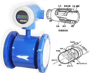 在結(jié)構(gòu)上,電磁流量計由電磁流量傳感器和轉(zhuǎn)換器兩部分組成。傳感器安裝在工業(yè)過程管道上,它的作用是將流進管道內(nèi)的液體體積流量值線性地變換成感生電勢信號,并通過傳輸線將此信號送到轉(zhuǎn)換器。轉(zhuǎn)換器安裝在離傳感器不太遠的地方,它將傳感器送來的流量信號進行放大,并轉(zhuǎn)換成流量信號成正比的標(biāo)準(zhǔn)電信號輸出,以進行顯示,累積和調(diào)節(jié)控制。