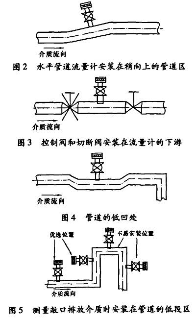 為了保障測量精度,傳感器應避免在容易產生真空、氣體、渦流等地方安裝。傳感器與智能變送器之間的通訊電纜要避開電動機等強電設備。建議安裝在圖2一圖5所示位置。