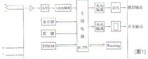 智能流量積算儀是由測量回路、數(shù)字面板表、調(diào)節(jié)器和電源四個部分組成。穩(wěn)壓電源將220V供電轉(zhuǎn)換成穩(wěn)定的直流電壓作為其它部分電源。測量回路將流量變送器送來的信號(電壓、電流等)經(jīng)過處理后,變?yōu)殡妷盒盘枴T撔盘柦?jīng)過A/D轉(zhuǎn)換后輸送到JC-775專用中央處理器進行處理后,不僅要送到數(shù)字面板表,而且也要送到調(diào)節(jié)器,與設(shè)定值比較后按調(diào)節(jié)規(guī)律輸出控制或報警信號。工作原理框(圖1)