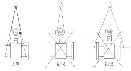 電磁流量計在搬運和吊裝傳感器時,應(yīng)該將吊索套在傳感器兩端頸部位置或吊環(huán)上,切勿在測量管內(nèi)套入管棒進(jìn)行吊裝,以免損壞襯里(見圖)。在吊裝和搬運電磁流量計過程中,必須防止傳感器襯里和接線盒受碰撞而損壞。