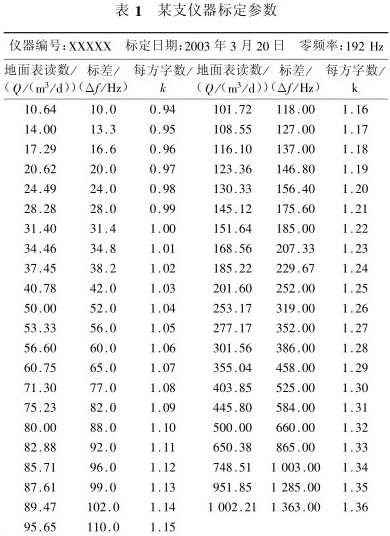 電磁流量計(jì)是一種直接測(cè)量流體流量的儀器,因此所測(cè)流量可直接讀取。而用渦輪流量計(jì)求取流量時(shí),首先需要經(jīng)過大量的線性回歸和公式計(jì)算,計(jì)算煩瑣且精度不高,給資料的解釋工作帶來較大難度。電磁流量計(jì)一般要經(jīng)過標(biāo)定才能在現(xiàn)場(chǎng)應(yīng)用,某支儀器的標(biāo)定參數(shù)見表1。