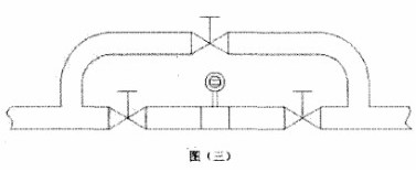5.被測(cè)介質(zhì)是嚴(yán)重污濁液體過(guò)容易在管道結(jié)垢的液體,可以在安裝傳感器的測(cè)量管道上加一個(gè)旁通管,以便于拆卸清洗。如圖三所示。