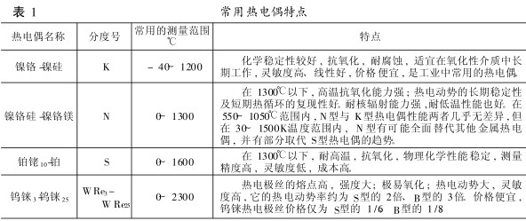 高溫測量中常用熱電偶及其特點如表1所示。在1250℃以下的場合,采用N型熱電偶測溫,其高溫穩定性及使用壽命較K型熱電偶成倍提高,通常與鉑銠熱電偶相當。因此,N型熱電偶的應用范圍在逐步擴大。鎢錸3-鎢錸25熱電偶高溫測量時可測的溫度最高,但在氧化氣體中測量,鎢錸3-鎢錸25極易氧化,因此必須采取抗氧化措施。可將偶絲密封在保護套管中,并填以致密的填充料,填充料中有遇高溫產生還原性氣氛的粉體,外保護管是鉬基硅化鉬管。