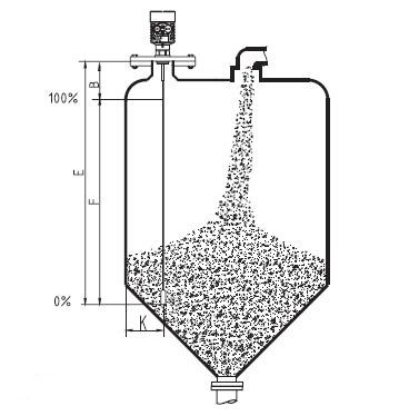通過輸入空罐高度E(=零點),滿罐高度F(=滿量程)及一些應用參數來設定,應用參數將自動使儀表適應測量環境。對應于4~20mA輸出。