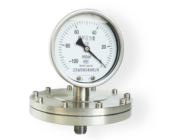 膜片壓力表由測量系統(tǒng)(包括法蘭接頭、波紋膜片)、傳動指示機構(gòu)(包括連桿、齒輪傳動機構(gòu)、指針和度盤)和外殼(包括表殼和罩圈)等組成。膜片壓力表外殼為防濺結(jié)構(gòu),具有較好的密性,故能保護(hù)其內(nèi)部機構(gòu)免受污穢浸入。