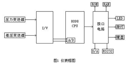 來自壓力變送器和差壓變送器的4~20毫安直流信號經I/V轉換成1~5伏電壓信號,再經A/D變換成數字量。數字濾波和統計估計可得數學模型計算所需的P、 和 。并按壓力P由相應子程序計算密度和熱焓,從而算出汽水兩相流的干度、質量流量和攜帶熱量,并對流量和熱量進行累積運算。鍵盤和LED用于常數設置和結果顯示,微打可定時或立即打印結果。D/A接口輸出干度信號,RS232接口可與上位機進行通訊。儀表原理框圖如圖1所示。